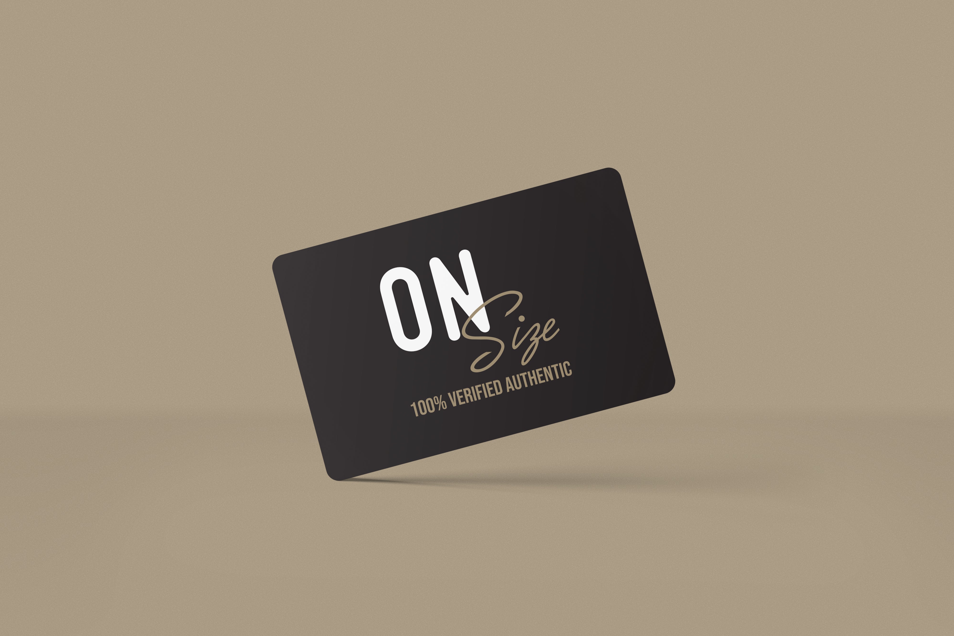 A sneakereinkhez tartozó OnSize plasztikkártya jellegzetes, így csak az általunk forgalmazott cipőknél található meg. Az egyik oldalán az OnSize logó látható és a “100% Verified Authentic” felirat, míg a másik oldalán egy erre az oldalra vezető QR kód van.